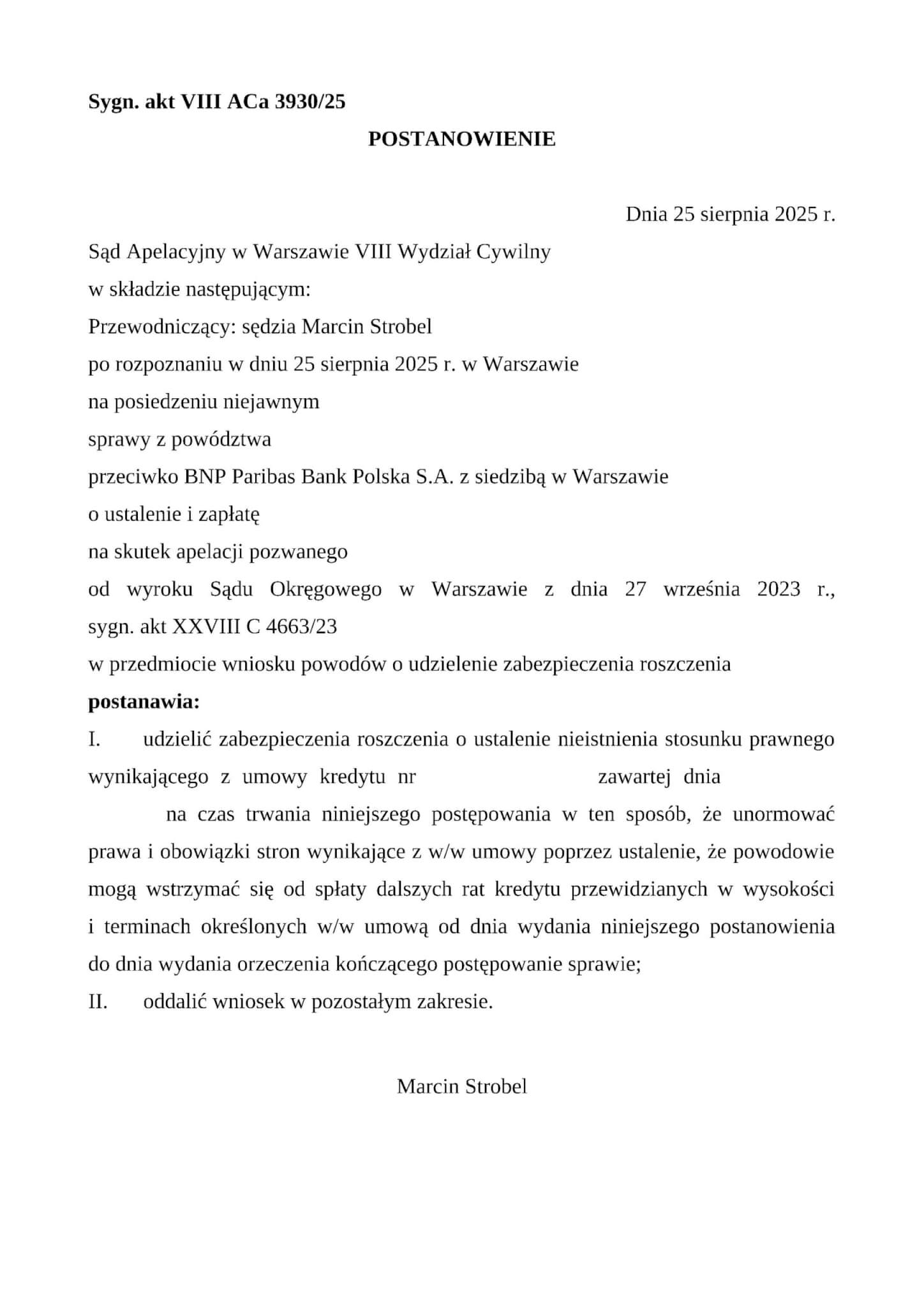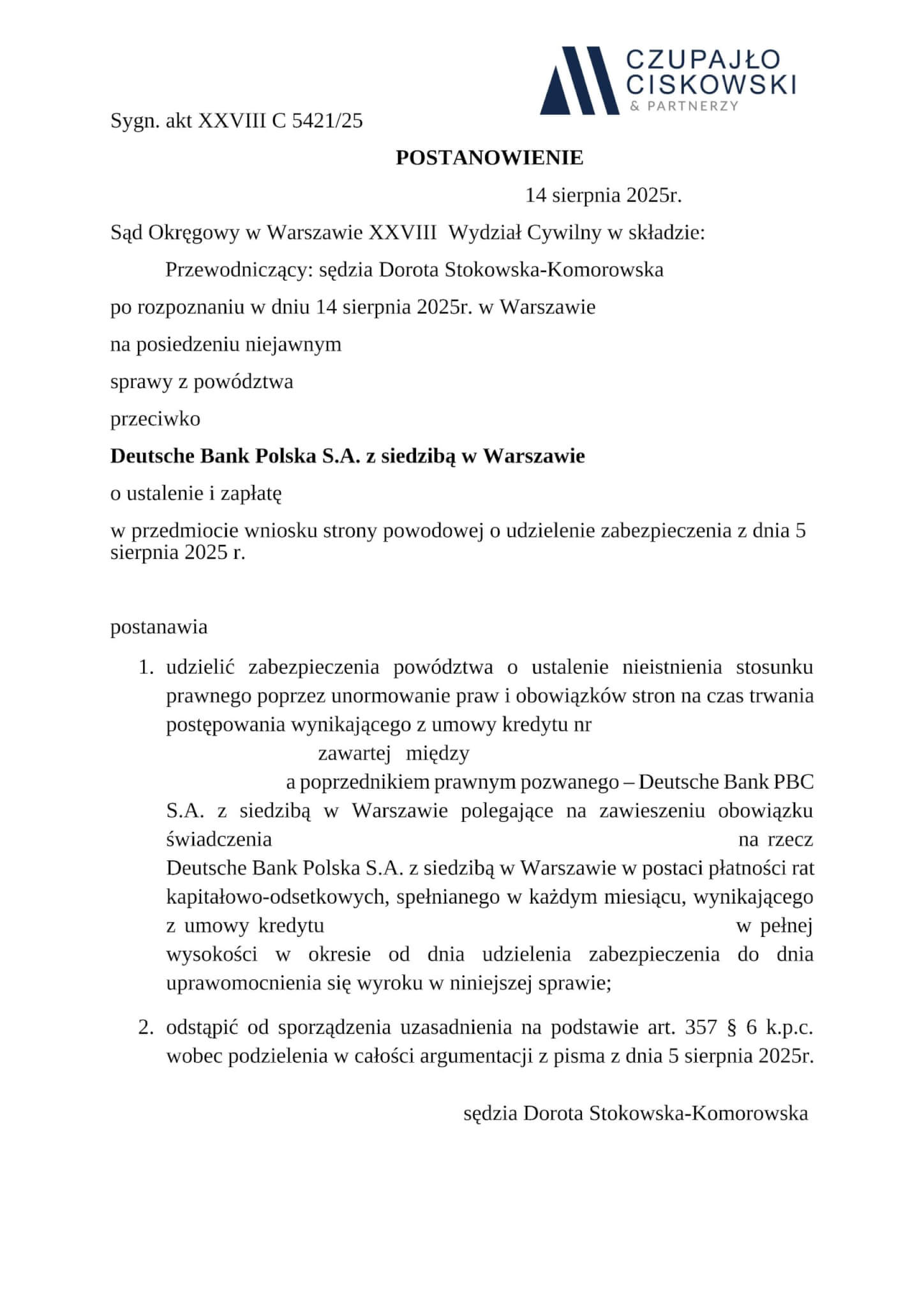 Sąd Okręgowy w Warszawie XXVIII Wydział Cywilny w składzie sędzi Doroty Stokowskiej-Komorowskiej po rozpoznaniu na posiedzeniu niejawnym w dniu 14 sierpnia 2025 r. sprawy z powództwa naszych Klientów przeciwko Deutsche Bank Polska spółce akcyjnej z siedzibą w Warszawie o ustalenie i zapłatę, w sprawie o sygn. akt XXVIII C 5421/25 postanowił udzielić zabezpieczenia roszczenia naszym Klientom.