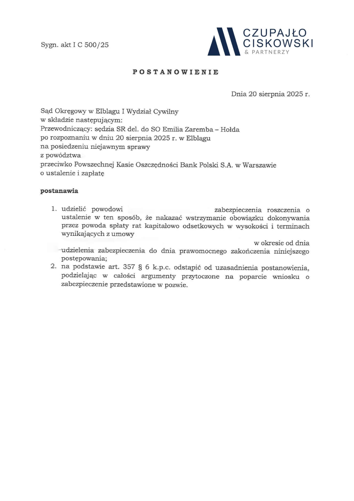 Sąd Okręgowy w Elblągu I Wydział Cywilny w składzie sędzi Emilii Zaręby-Hołdy po rozpoznaniu na posiedzeniu niejawnym w dniu 20 sierpnia 2025 r. sprawy z powództwa naszego Klienta przeciwko Powszechnej Kasie Oszczędności Bankowi Polskiemu S.A. w Warszawie o ustalenie i zapłatę, w sprawie o sygn. akt I C 500/25 postanowił udzielić zabezpieczenia roszczenia naszemu Klientowi.