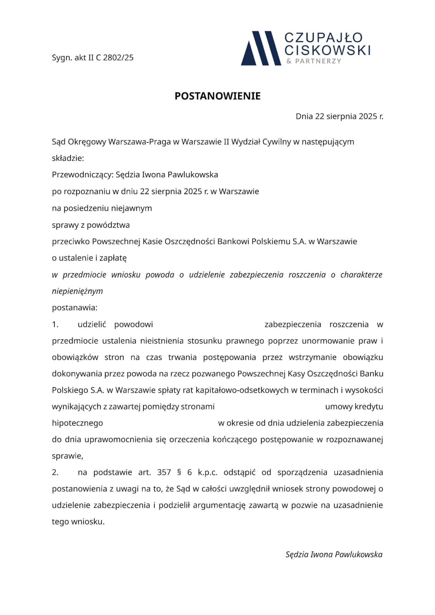 Sąd Okręgowy Warszawa-Praga w Warszawie II Wydział Cywilny w składzie sędzi Iwony Pawlukowskiej po rozpoznaniu na posiedzeniu niejawnym w dniu 22 sierpnia 2025 r. sprawy z powództwa naszego Klienta przeciwko Powszechnej Kasie Oszczędności Bankowi Polskiemu S.A. w Warszawie o ustalenie i zapłatę, w sprawie o sygn. akt II C 2802/25 postanowił udzielić zabezpieczenia roszczenia naszemu Klientowi.