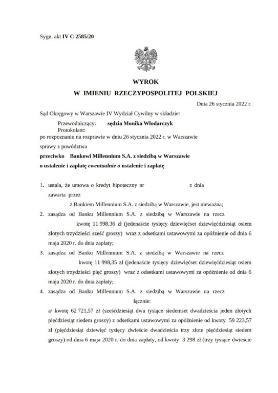 Sąd Okręgowy w Warszawie, IV Wydział Cywilny w składzie SSO Monika Włodarczyk w dniu 26 stycznia 2022 r. wydał wyrok w sprawie naszych Klientów przeciwko Bankowi Millenium S.A., w którym: