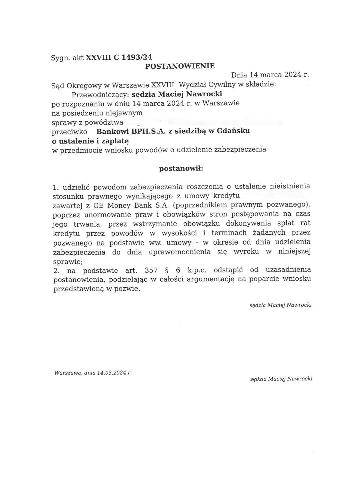 Sąd Okręgowy w Warszawie, XXVIII Wydział Cywilny w składzie SSO Maciej Nawrocki po rozpoznaniu na posiedzeniu niejawnym w dniu 14 marca 2024 r. sprawy z powództwa naszych Klientów przeciwko Bankowi BPH S.A. z siedzibą w Gdańsku o ustalenie i zapłatę w sprawie o sygn. akt XXVIII C 1493/24 postanowił udzielić zabezpieczenia roszczenia naszym Klientom..