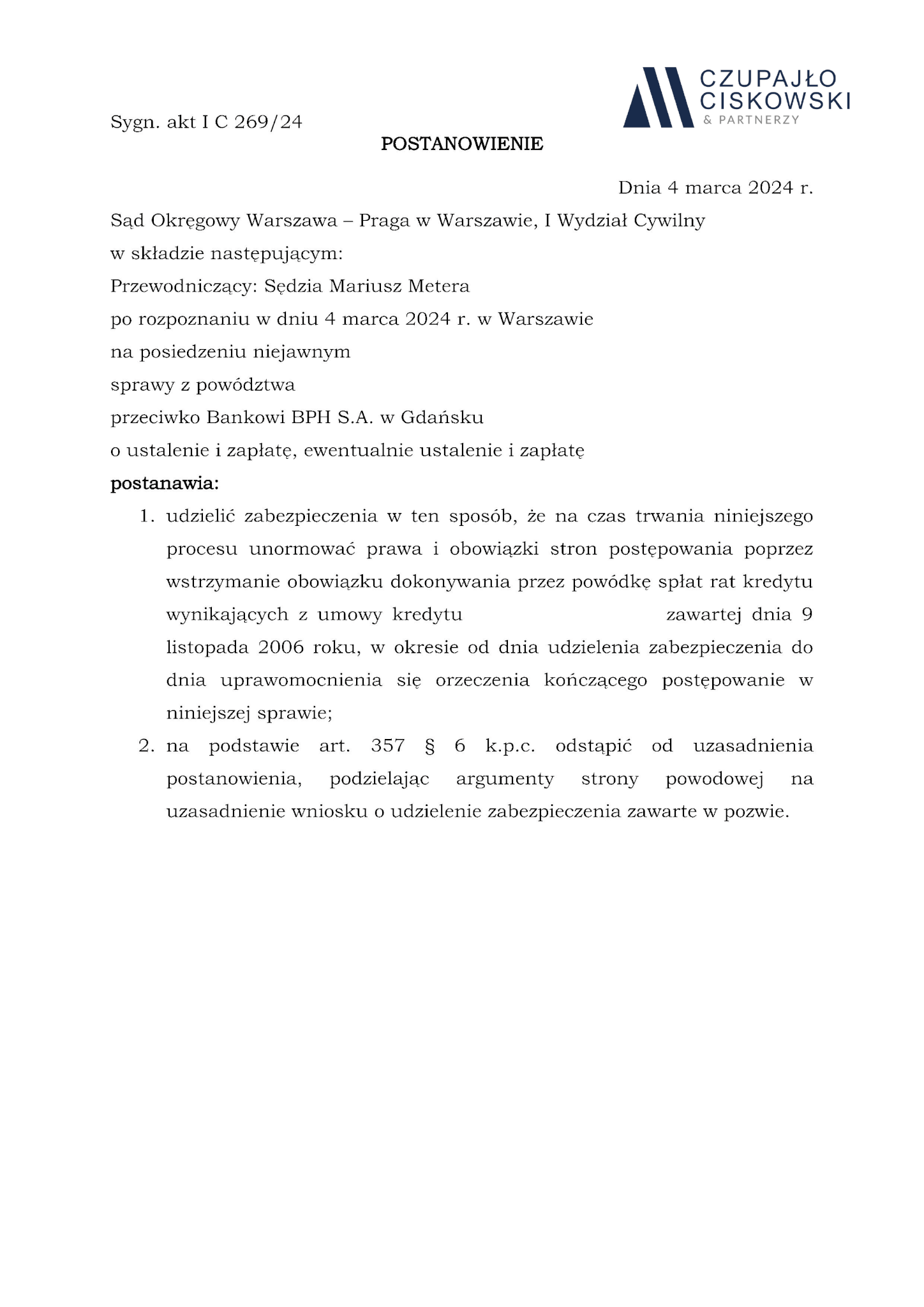 Sąd Okręgowy w Warszawa-Praga w Warszawie, I Wydział Cywilny w składzie SSO Mariusz Metera po rozpoznaniu na posiedzeniu niejawnym w dniu 4 marca 2024 r. sprawy z powództwa naszej Klientki przeciwko Bankowi BPH S.A. z siedzibą w Gdańsku o ustalenie i zapłatę w sprawie o sygn. akt I C 269/24 postanowił udzielić zabezpieczenia roszczenia naszej Klientce.