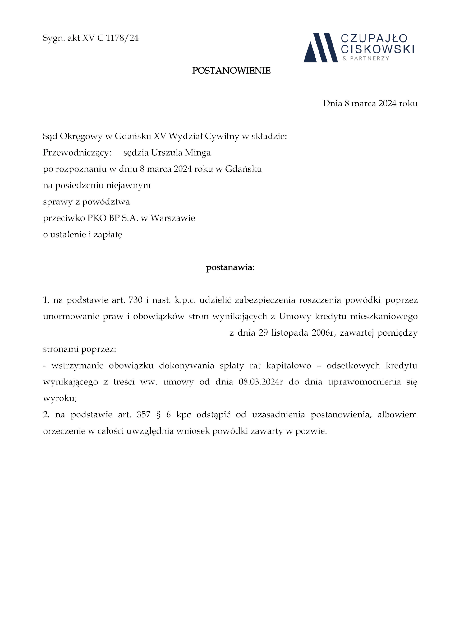 Sąd Okręgowy w Gdańsku XV Wydział Cywilny w składzie SSO Urszula Minga po rozpoznaniu na posiedzeniu niejawnym w dniu 8 marca 2024 r. sprawy z powództwa naszej Klientki przeciwko Bankowi BPH S.A. z siedzibą w Gdańsku o ustalenie i zapłatę w sprawie o sygn. akt XV C 1178/24 postanowił udzielić zabezpieczenia roszczenia naszej Klientce