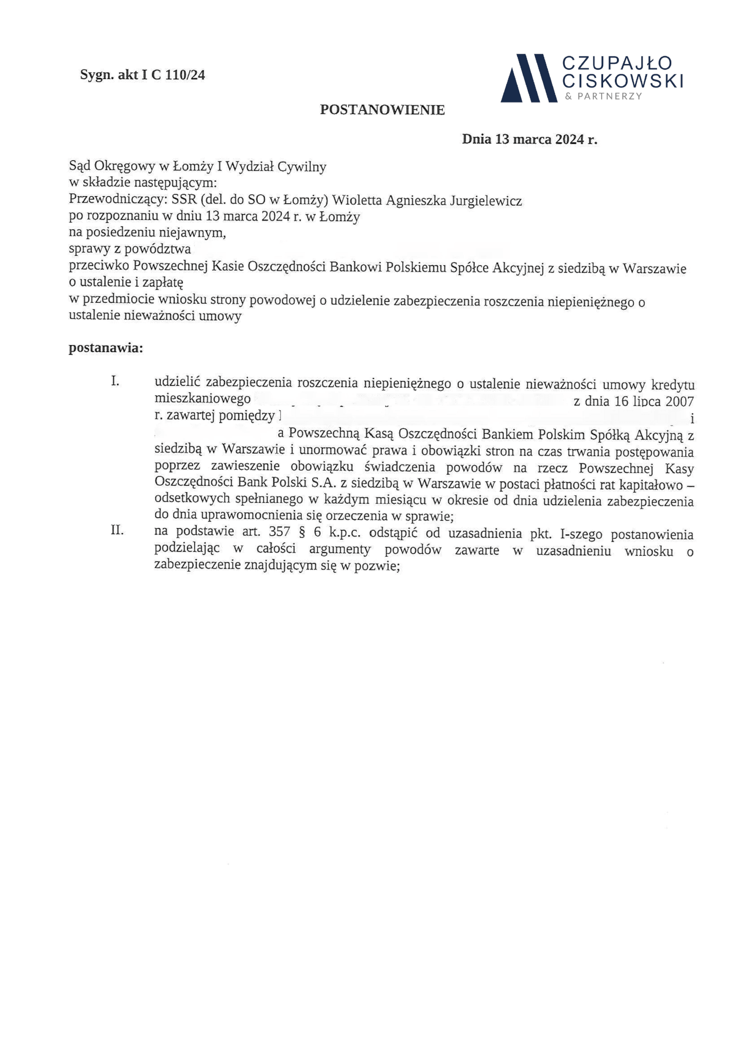 Sąd Okręgowy w Ostrołęce, I Wydział Cywilny w składzie SSO Tomasz Deptuła po rozpoznaniu na posiedzeniu niejawnym w dniu 4 marca 2024 r. sprawy z powództwa naszych Klientów przeciwko Powszechnej Kasie Oszczędności Bank Polski S.A. z siedzibą w Warszawie o ustalenie i zapłatę w sprawie o sygn. akt I C 101/24 postanowił udzielić zabezpieczenia roszczenia naszym Klientom..