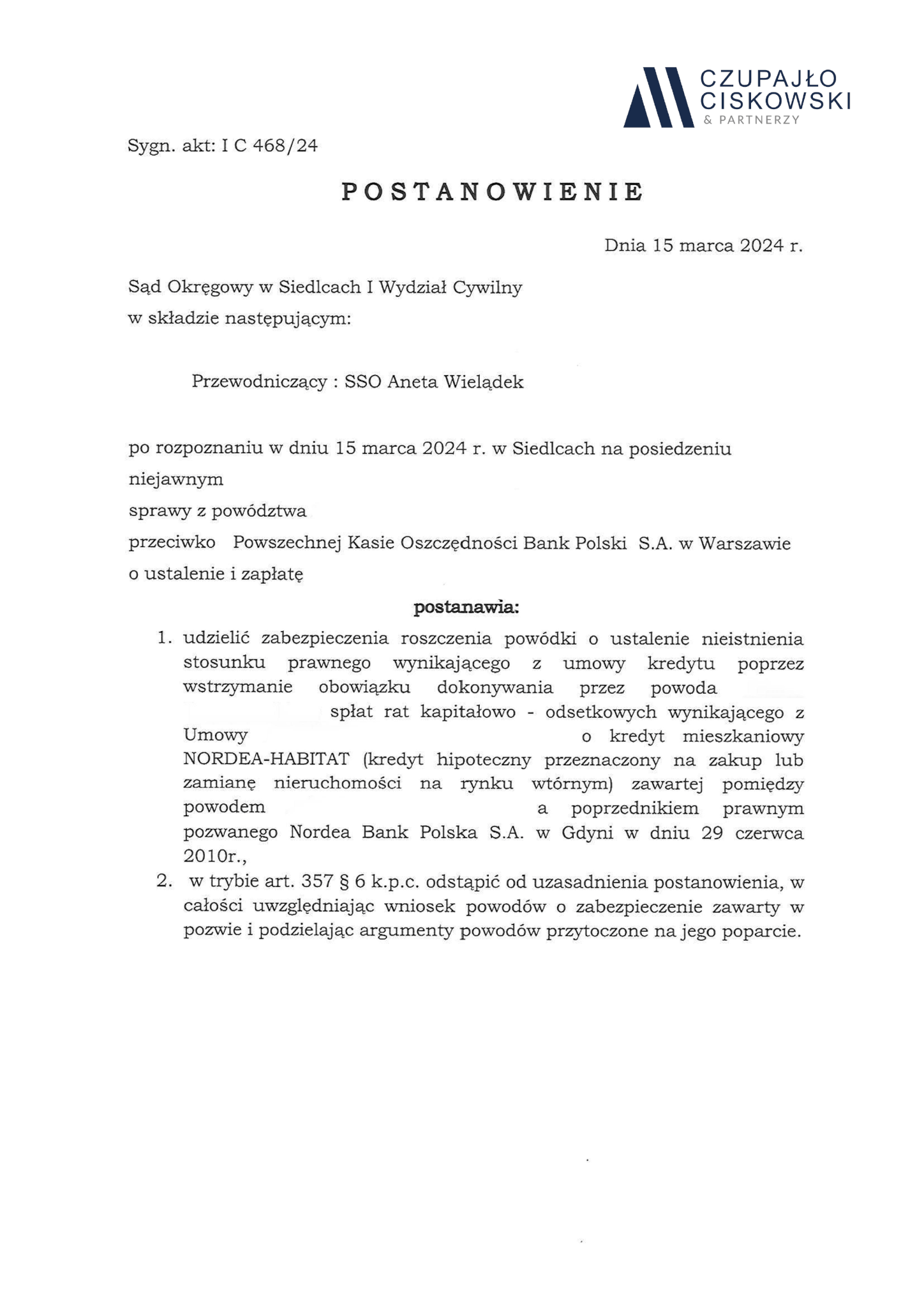 Sąd Okręgowy w Siedlcach, I Wydział Cywilny w składzie SSO Aneta Wielądek po rozpoznaniu na posiedzeniu niejawnym w dniu 15 marca 2024 r. sprawy z powództwa naszego Klienta przeciwko Powszechnej Kasie Oszczędności Bank Polski S.A. z siedzibą w Warszawie o ustalenie i zapłatę w sprawie o sygn. akt I C 468/24 postanowił udzielić zabezpieczenia roszczenia naszemu Klientowi.