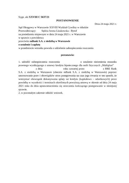 Sąd Okręgowy w Warszawie XXVIII Wydział Cywilny po rozpoznaniu w dniu 24 maja 2021 r. na posiedzeniu niejawnym sprawy z powództwa naszych Klientów przeciwko mBank S.A. z siedzibą w Warszawie o ustalenie i zapłatę, sygn. akt XXVIII C 5637/21, postanowił udzielić zabezpieczenia roszczenia o ustalenie nieważności umowy kredytu hipotecznego waloryzowanego kursem CHF.
